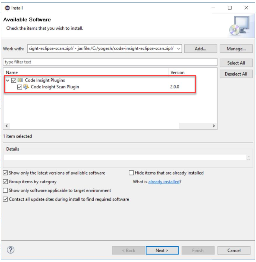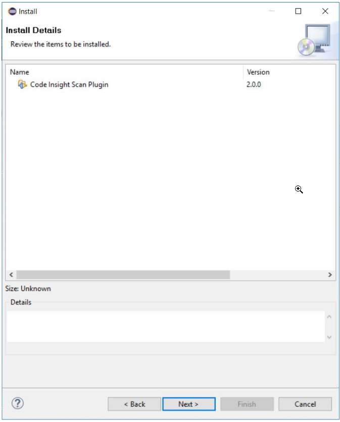 6. Click the checkbox next to the Code Insight Scan Plugin entry, and click Next. The Install Details window is displayed, listing the plugin you are preparing to install.