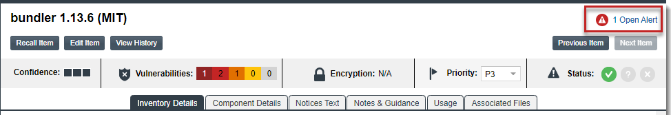 This procedure describes how to access the security vulnerability alerts for a specific inventory item from the Project Inventory tab for a project.