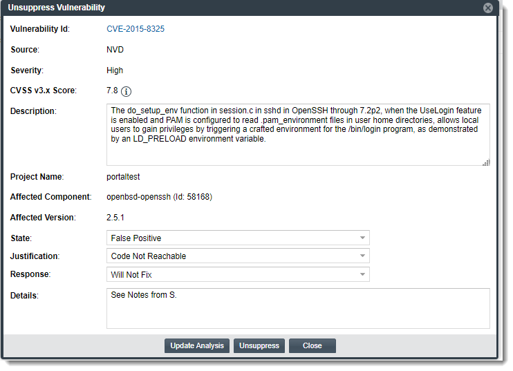 noteThe Unsuppress button is enabled for only those vulnerabilities that you have permissions to unsuppress or on which to perform analysis updates. That is, you must be either a System Administrator or the Security Contact or Developer Contact for the project for which the given vulnerability was suppressed. For all other users, this button is disabled.